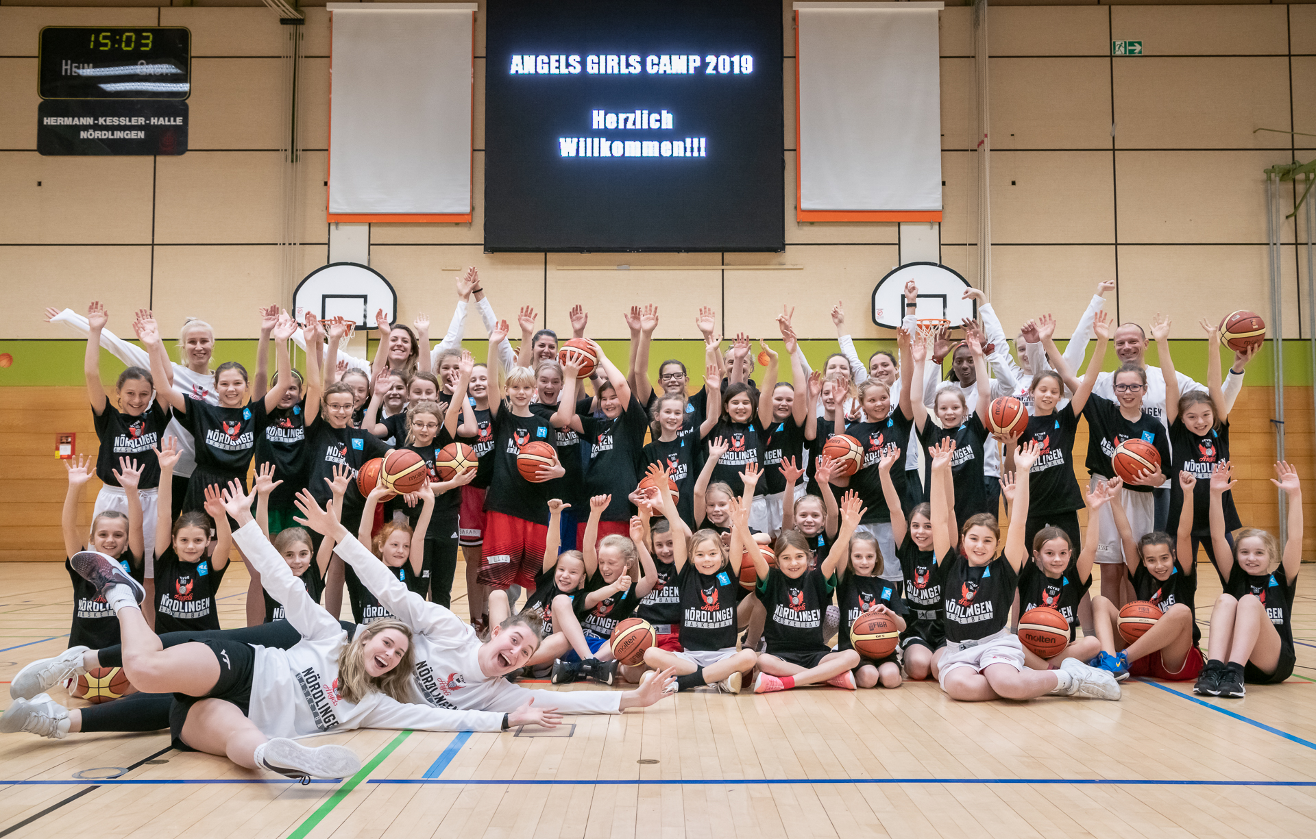 Aus der Not eine Tugend machte die BG Donau-Ries mit ihrer Bundesligamannschaft, den XCYDE Angels aus Nördlingen. Der aufgrund des Rückzugs von Bad Aibling weggefallene Heimspieltag wurde kurzerhand dem Nachwuchs gewidmet und ein Girlscamp veranstaltet. 43 Mädchen der Jahrgänge 2007 bis 2010 folgten dem Ruf der Engel und fanden sich am Sonntag Vormittag in der Hermann-Keßler-Halle ein. Unter der professionellen Anleitung von Headcoach Pat Bär und der kompletten Bundesliga-Mannschaft wurde nun gepasst, geworfen, gedribbelt und verteidigt, was das Zeug hielt. In kleinen Spielen wurden Wettbewerbe durchgeführt und am Ende durften die von den Coaches gewählten All-Stars mit ihren Idolen noch zusammen in Teams 5-gegen-5 spielen. Als Erinnerung nahmen die begeisterten Mädchen auch noch ein Camp-Shirt mit nach Hause. Die ganze Veranstaltung wurde vom Gesundheitspartner der Angels, der TK Versicherung unterstützt und schreit schon jetzt nach einer Wiederholung, auch wenn kein Bundesligaspiel ausfällt.