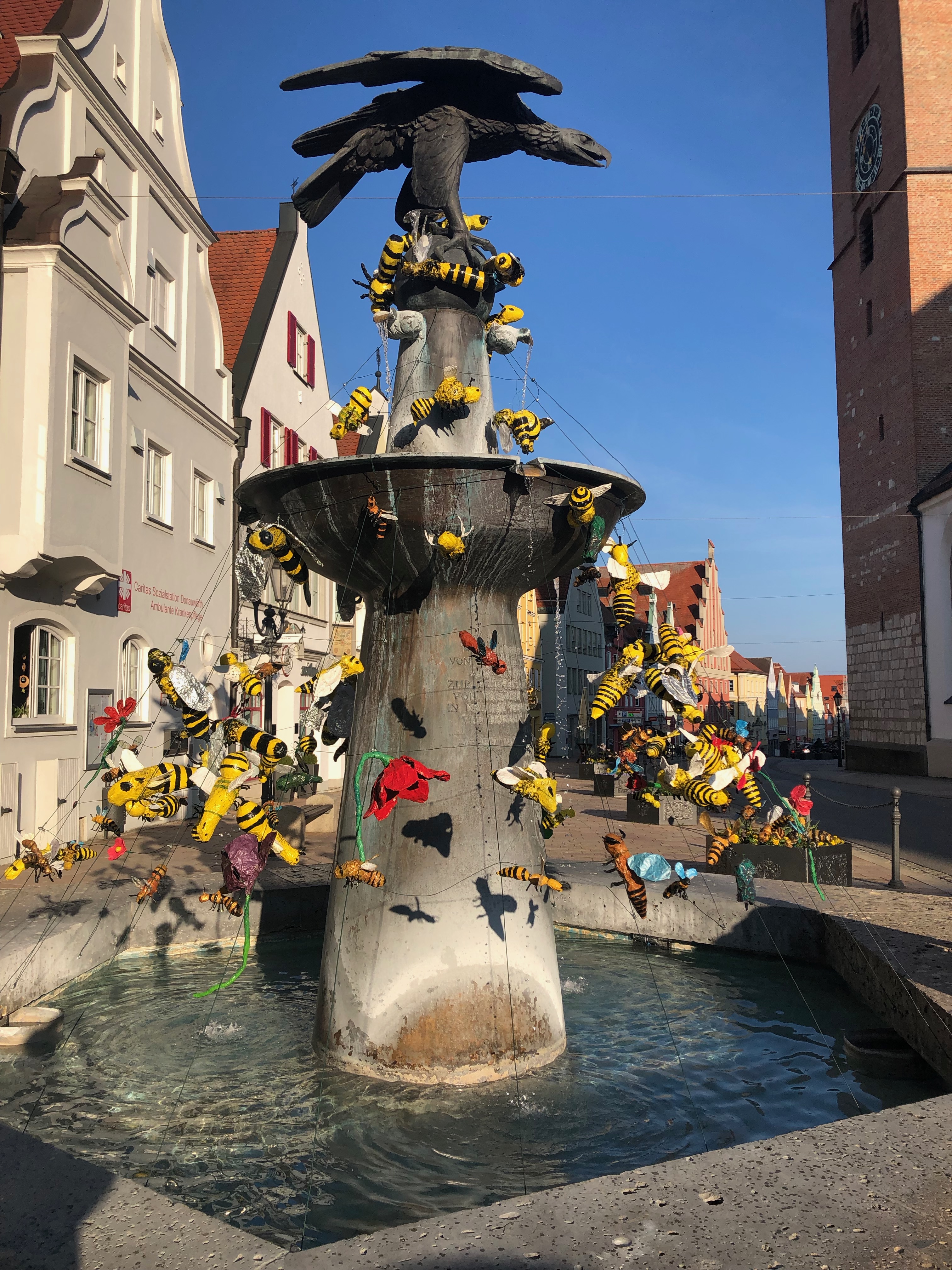 Die Donauwörther Brunnen werden nach fränkischem Brauch jedes Jahr zur Osterzeit geschmückt. Sie sind die Farbtupfer in unserer Stadt und den Stadtteilen. Abwechselnd stellt sich eine der Donauwörther Schulen der schönen Aufgabe, den Reichsstadtbrunnen in der oberen Reichsstraße zu dekorieren. Heuer durften sich die 5. und 6. Klassen des Gymnasiums Donauwörth zum Thema "Biene" kreativ austoben.