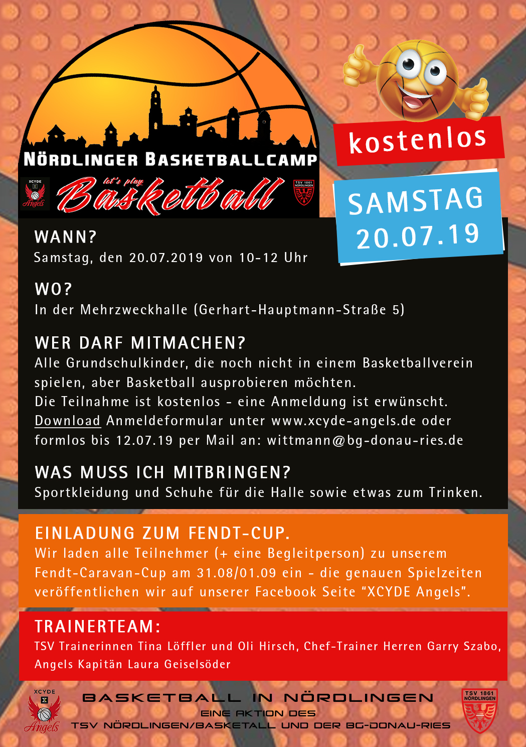 Am 20.07.2019 veranstaltet die BG Donau-Ries mit ihrer Bundesligatruppe, den XCYDE Angels, in Zusammenarbeit mit dem TSV Nördlingen ein Basketball-Camp für Grundschulkinder.